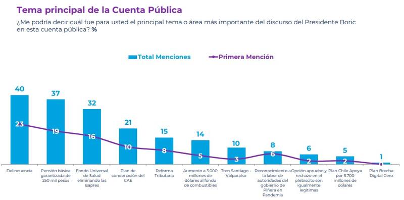 Asimismo, la delincuencia fue el tema considerado como el más importante en el discurso de Boric, con un 40%. A este tema le sigue la pensión básica garantizada de 250 mil pesos (37%), el Fondo Universal de Salud eliminando las Isapres (32%), el plan de condonación del CAE (21%) y la reforma tributaria (15%).