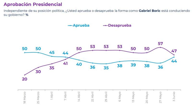 Este domingo se dieron a conocer los resultados de la encuesta Plaza Pública Cadem, correspondientes a la primera semana de junio, los cuales revelaron un importante aumento de 8 puntos en la aprobación a la gestión del Presidente Gabriel Boric, alcanzando el 44%, mientras que la desaprobación cayó en 10 puntos, llegando a 47%.