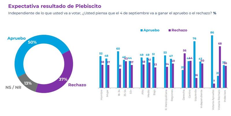 A la vez, el 50% de los consultados cree que el próximo 4 de septiembre triunfará el Apruebo, por sobre el 37% que piensa que ganará el Rechazo.
