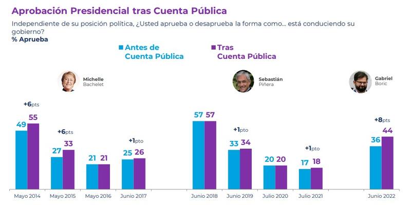 Este incremento en la aprobación se consolida como el más alto registrado después de una cuenta pública, superando el alza en 6 puntos de la ex Presidenta Michelle Bachelet en mayo de los años 2014 y 2015.