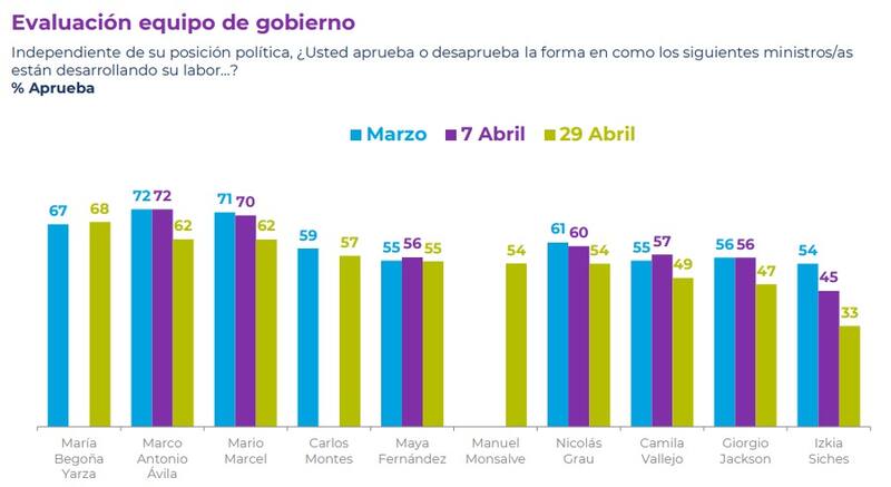 En cuanto a otros secretarios de Estado, el sondeo develó que la titular de Salud, María Begoña Yarza, es la mejor evaluada, con un 68%. A ella le siguen los ministros de Educación, Marco Antonio Ávila, y de Hacienda, Mario Marcel, ambos con un 62%. Este último además es considerado ahora el ministro más influyente, lo que quedó en evidencia en el aumento de 6 puntos más que en el sondeo anterior, llegando al 26%, y superando a lo obtenido por Siches (20%), Giorgio Jackson (17%) y Camila Vallejo (15%).
