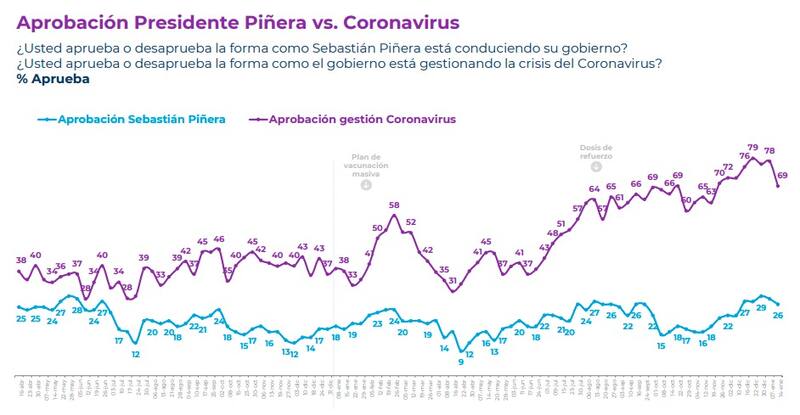 Este domingo se dieron a conocer los resultados de la encuesta Plaza Pública Cadem, que corresponde al periodo comprendido entre el pasado miércoles 12 al viernes 14 de enero, la cual reveló que la aprobación del gobierno en torno a la gestión del Covid-19 registró una caída de 9 puntos porcentuales, de un 78% evidenciado la semana pasada, a un 69%.