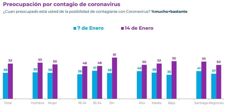 En este sentido, el sondeo dio a conocer que existe un incremento en la preocupación por contagiarse con Coronavirus, ya que en los últimos siete días ha aumentado en 14 puntos, llegando al 52%, siendo el rango de las personas mayores de 55 años quienes evidenciaron una mayor preocupación, al pasar de un 38% el 7 de enero, a un 61% el pasado viernes.