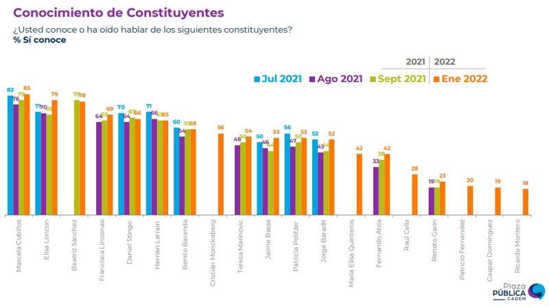 Por otra parte, y en cuanto a la Convención Constitucional, la encuesta dio a conocer que un 55% de las personas sondeadas confía mucho o bastante en este órgano constituyente. Asimismo, entre los convencionales que se ubican entre aquellos con mayor conocimiento y aprobación son Marcela Cubillos (UDI), Elisa Loncón (IND), Beatriz Sánchez (AD), Francisca Linconao (IND), Daniel Stingo (IND-RD), Hernán Larraín (Evopoli), y Benito Baranda (INN).