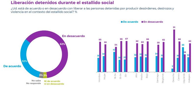 Este domingo se dieron a conocer los resultados de la encuesta Plaza Pública Cadem, que además evidenció que, respecto a la idea de liberar a personas detenidas por producir desórdenes, destrozos y violencia en el contexto del estallido social, un 62% se mostró en desacuerdo, mientras que el 32% de los encuestados aprueba esta medida.