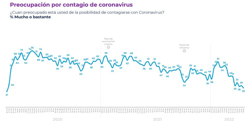 Finalmente, el temor a contagiarse con Coronavirus alcanzó el 26%, el nivel más bajo desde que comenzó la pandemia en Chile en marzo de 2020.