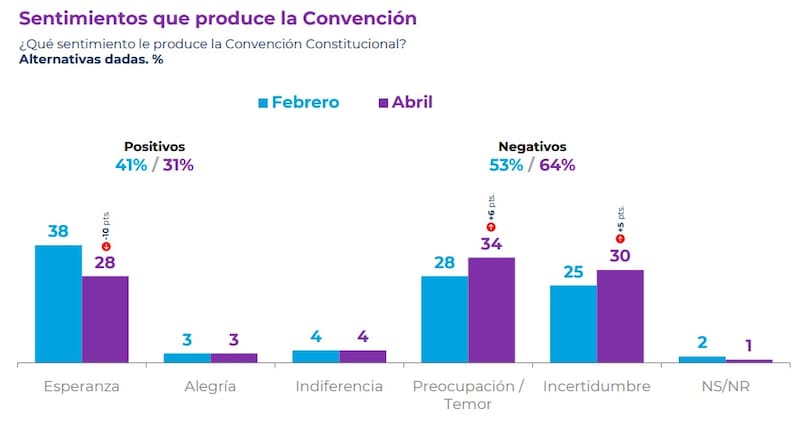 A la vez, en torno a los sentimientos que produce el órgano redactor, la esperanza cayó 10 puntos, de 38% en febrero a 28% en este mes, mientras que la preocupación incrementó de 28% a 34%, al igual que la incertidumbre de 25% a 30%.