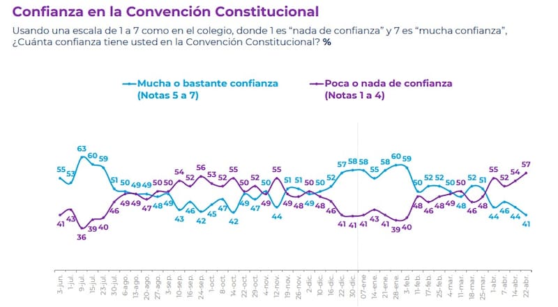 Respecto a la Convención Constitucional, la intención de votar rechazo se mantiene por cuarta semana consecutiva por sobre el apruebo con un 46% contra un 37%, respectivamente. Asimismo, la confianza en la Convención alcanzó su punto más bajo desde que comenzó su trabajo, obteniendo un 41%.