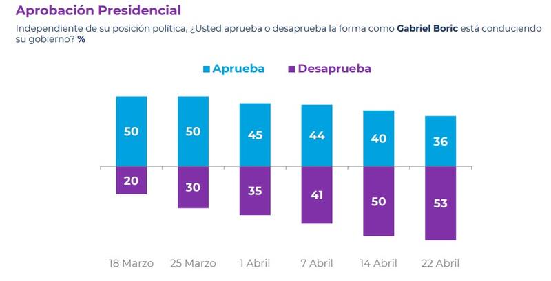 Este domingo se dieron a conocer los resultados de la encuesta Plaza Pública Cadem correspondiente a la tercera semana de abril, y tal como ha sido la tendencia durante las últimas semanas, el sondeo reveló un leve aumento en la desaprobación a la forma como el Presidente Gabriel Boric está conduciendo su gobierno, alcanzando un 53%, mientras que la aprobación bajó al 36%.