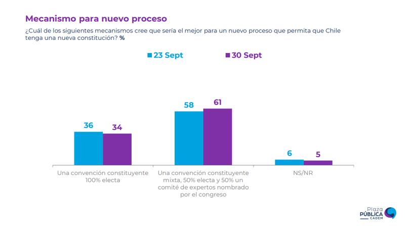 Mientras que un 61% cree que debe ser mediante una Convención Constituyente mixta, acompañada por un panel de expertos nombrados por el Congreso, opción que aumentó tres puntos desde la medición anterior del 23 de septiembre pasado.