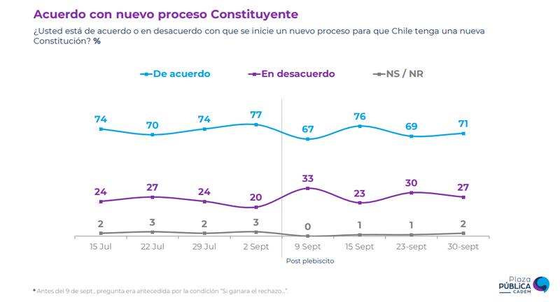 Ante la pregunta “¿usted está de acuerdo o en desacuerdo con que se inicie un nuevo proceso para que Chile tenga una nueva Constitución?”, un 71% se mostró a favor de que se establezcan las bases para la redacción de una nueva Carta Magna. En tanto, 27% se mostró en desacuerdo, lo que significa una disminución de tres puntos respecto a la medición pasada, cuando se registraba un 30 % la tercera semana de septiembre.