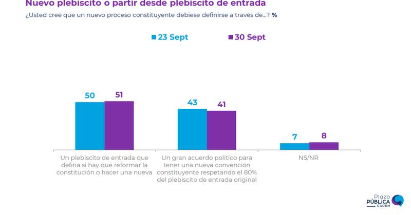 Sobre cómo debería definirse ese nuevo camino por un nuevo texto constitucional, un 51% cree que debe hacerse mediante un plebiscito de entrada donde se defina si hay que efectuar reformas a la Constitución vigente o redactar una nueva y un 41% cree que debe darse por “un gran acuerdo político para tener una nueva convención constituyente respetando el 80% del plebiscito de entrada original”.
