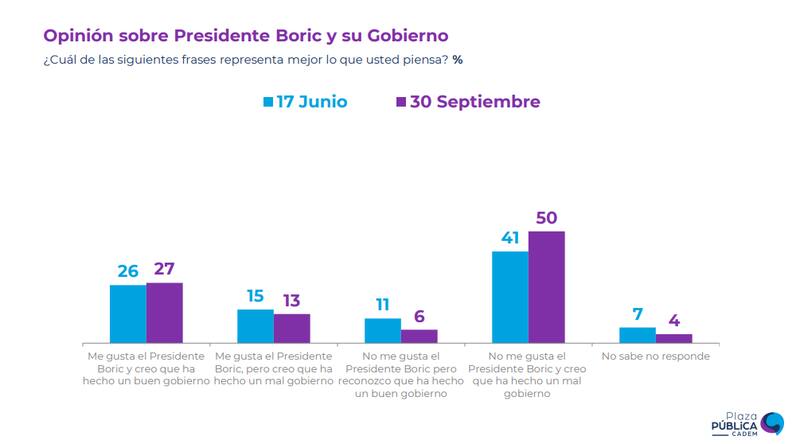 Ante el escenario de “me gusta el Presidente Boric y creo que ha hecho un buen gobierno”, un 27% respalda dicha afirmación, mostrando una variación de un punto cuando se preguntó lo mismo el 17 de junio pasado.