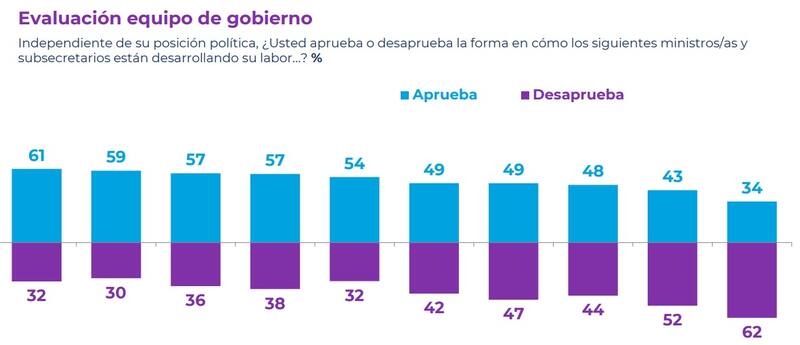 Asimismo, entre los miembros del gabinete, el titular de Hacienda, Mario Marcel (61%) y el subsecretario Manuel Monsalve (59%) se posicionan como los mejor evaluados, mientras que la ministra del Interior y Seguridad Pública, Izkia Siches, se mantiene con la más baja aprobación (34%,).