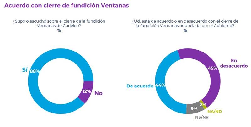 Sobre el cierre de la fundición Ventanas de Codelco, se evidenció casi un empate entre quienes están de acuerdo con esta decisión, que corresponde al 44% de los encuestados, frente a un 45% que se opone. En esta misma línea, el 21% cree que debe cerrarse ahora y el 70% de forma paulatina.