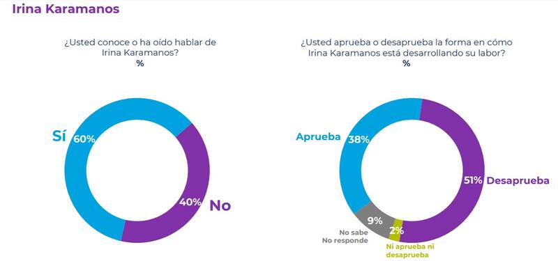 El sondeo de opinión dio a conocer además que solo un 38% aprueba la forma en cómo la Primera Dama, Irina Karamanos, está desarrollando su labor, contra un 51% que la desaprueba.