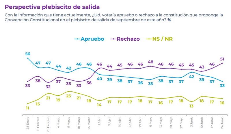 En relación con el plebiscito de salida del próximo 4 de septiembre, la encuesta develó que la intención de votar Rechazo a la nueva Constitución subió a 51%, ampliando en 18 puntos la ventaja sobre la opción Apruebo, que cayó al 33%, estableciendo la mayor diferencia para la primera alternativa desde que se tiene registro.