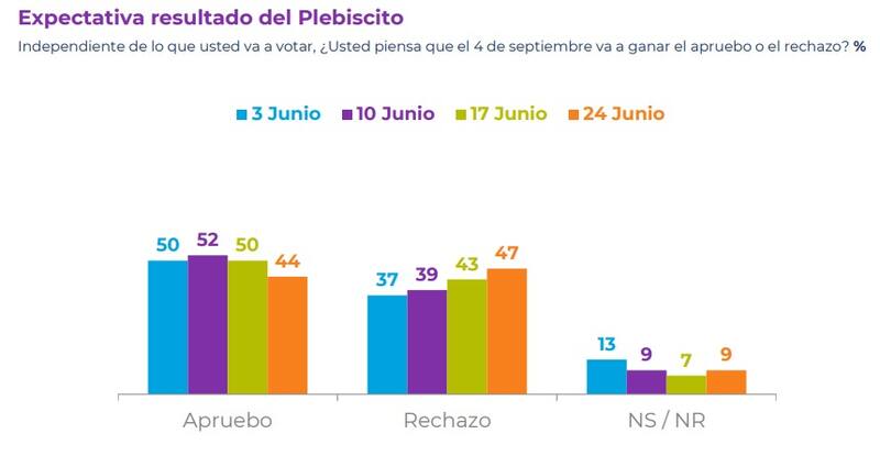En relación con el plebiscito de salida del próximo 11 de septiembre, el sondeo de opinión reveló que por primera vez se observa la tendencia de que más gente cree que ganará la opción Rechazo (47%) por sobre quienes piensan que se impondrá el Apruebo (44%).