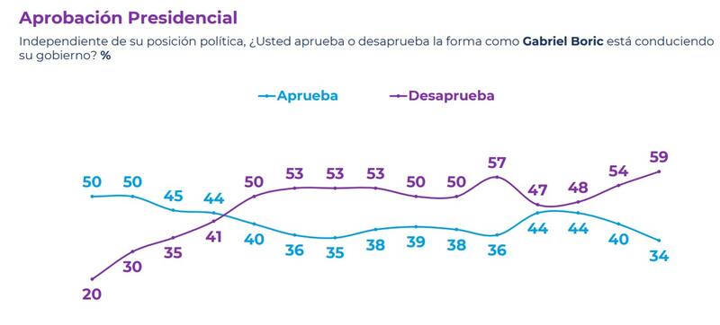 En este contexto, el porcentaje neto de aprobadores menos desaprobadores llegó a -25 puntos, resultado que alcanzó la ex Presidenta Michelle Bachelet tras revelarse el caso Caval, y por el exmandatario Sebastián Piñera en el mes de junio de su segundo año de gobierno.