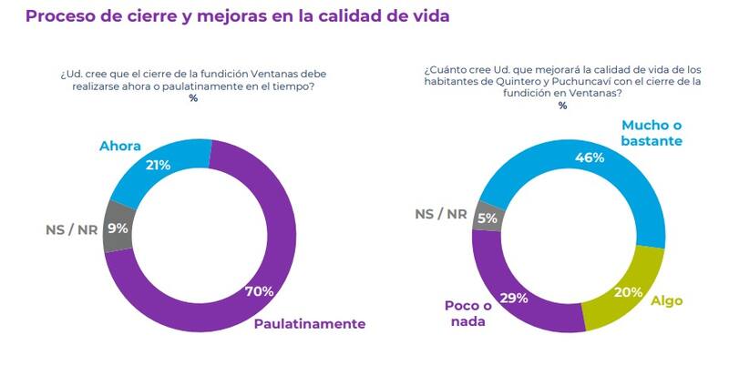 Pese a lo anterior, el 46% cree que mejorará mucho o bastante la calidad de vida de los habitantes de Quintero y Puchuncaví con el cierre de la fundición, contra el 29% que piensa que será poco o nada y el 20% que cree que en algo mejorará.