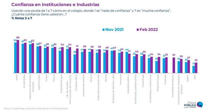 Asimismo, el sondeo dio a conocer que Metro (69%), las universidades (63%) y los laboratorios de remedios nacionales (62%) son las instituciones e industrias de mayor confianza en el país. Mientras que las autopistas (30%), Isapres (27%) y AFPs (22%) son las tres que generan menor confianza.