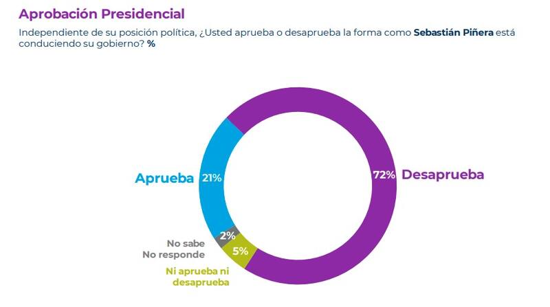 Este domingo se dieron a conocer los resultados de la encuesta Plaza Pública Cadem, que corresponde al periodo comprendido entre el pasado miércoles 16 y el jueves 17 de febrero, la cual reveló que la aprobación a la forma como el Presidente Sebastián Piñera está conduciendo su gobierno bajó cuatro puntos porcentuales, llegando al 21% mientras que la desaprobación alcanzó al 72%, a solo tres semanas del término de su mandato.