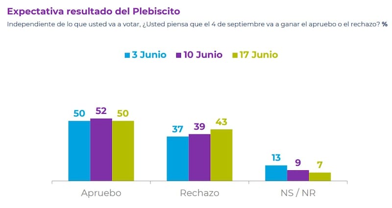 Independiente de lo que ocurra, aún en las expectativas de cuál de las opciones vencerá en las votaciones, el Apruebo alcanza el 50%, mientras que el Rechazo llegó al 43%. Pese a ello, al 58% de los consultados le provoca preocupación o temor la propuesta de nueva Constitución, y sólo al 36% le causa esperanza.