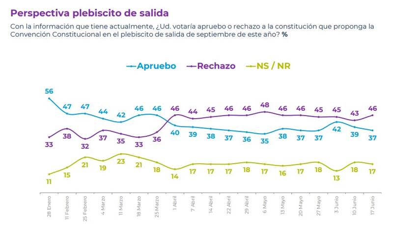 En otro aspecto, se dio a conocer un leve aumento de 3 puntos en la intención de votar Rechazo en el plebiscito de salida del próximo 4 de septiembre, llegando al 46%, resultado que distancia en 9 puntos con la opción Apruebo, que cayó 2 puntos y obtuvo el 37%.