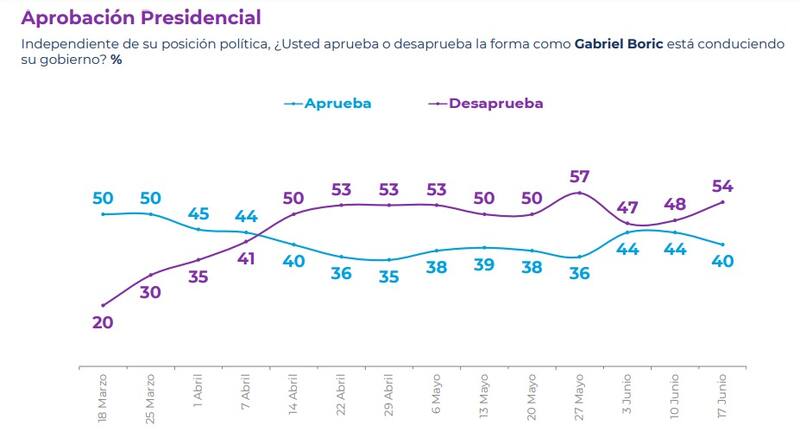 En el transcurso de la última semana se incrementó en 6 puntos porcentuales la desaprobación al mandatario, alcanzando el 54%, mientras que su aprobación bajó de 44% a 40%. En relación al proceso constituyente, un 11% de los consultados quiere que la nueva Carta Magna se apruebe tal como está propuesta.