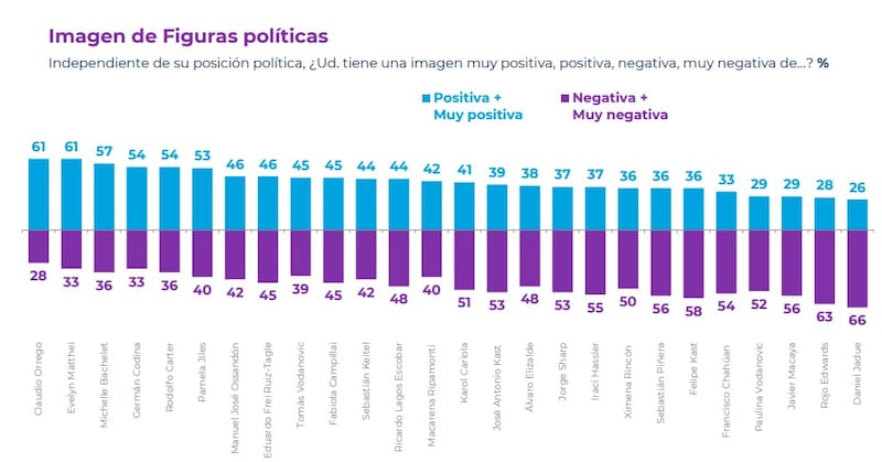 En cuanto al ítem de personajes políticos, Claudio Orrego (61%), Evelyn Matthei (61%) y Michelle Bachelet (57%) aparecen como los mejor evaluados, mientras que Javier Macaya (29%), Rojo Edwards (28%) y Daniel Jadue (26%) se mantienen como los peor evaluados.
