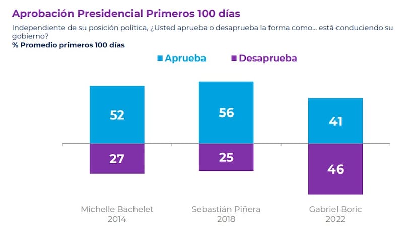 Este domingo se dieron a conocer los resultados que arrojó la encuesta Plaza Pública Cadem, correspondiente a la tercera semana de junio, los cuales revelaron que Gabriel Boric es el Presidente que registra el promedio de aprobación más bajo de los primeros 100 días de mandato desde el año 2014, consignando un 41%, mientras que su desaprobación alcanza el 46%.
