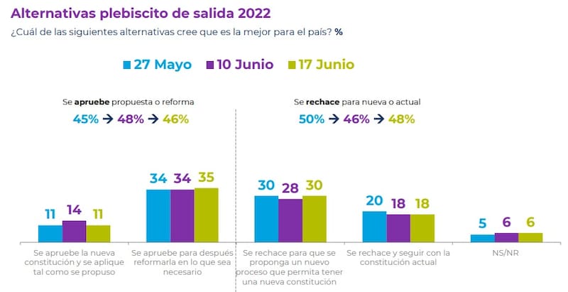 Sobre las alternativas del proceso, sólo 11% quiere que la nueva Constitución se apruebe tal como está propuesta, mientras que el 35% optó porque se apruebe para después reformarla en lo que sea necesario. No obstante, el 30% prefiere que se rechace para que se proponga un nuevo proceso que permita tener una nueva Constitución y se mantiene el 18% que quiere rechazar la nueva Carta Fundamental para seguir con el texto vigente, nacido en dictadura.