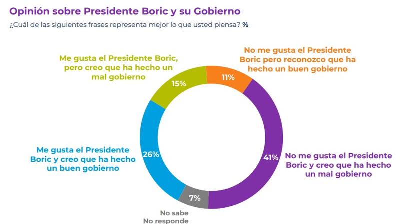 El sondeo de opinión develó que al 41% de los encuestados no le gusta el Presidente Boric y piensan que ha hecho un mal gobierno, lo que se contrapone con el 26% que sí le gusta el mandatario y cree que lo ha hecho bien.