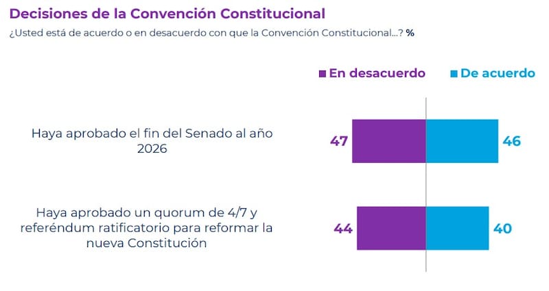En este sentido, la encuesta reveló que el 63% cree que los expresidentes deberían ser invitados al acto de cierre del órgano redactor, en contra del 34% que opina lo contrario. En la misma línea, se evidenció casi un empate técnico en torno a que se haya aprobado el fin del Senado al año 2026, donde el 47% está en desacuerdo contra un 46% que está de acuerdo.