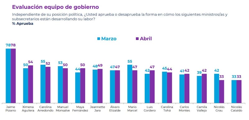 Por otra parte, el sondeo revela que el ministro del Deporte, Jaime Pizarro, sigue liderando el ranking de aprobación del gabinete con un 78%, seguido por la titular de Salud, Ximena Aguilera (54%) y la ministra de las Culturas, las Artes y el Patrimonio, Carolina Arredondo (52%).
