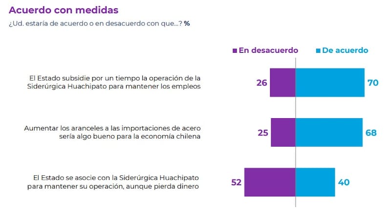 Asimismo, un 70% de los encuestados se mostró a favor de que el Estado subsidie por un tiempo la operación de la referida usina para mantener los empleos, y un 68% está de acuerdo con que el aumento de los aranceles a las importaciones de acero sería algo bueno para la economía chilena.