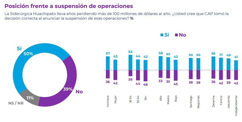 En este contexto, y considerando que la referida usina lleva años perdiendo más de 100 millones de dólares al año, un 50% de los consultados por Cadem cree que CAP tomó la decisión correcta al anunciar la suspensión de tales operaciones.