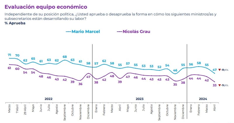 El sondeo de opinión semanal arrojó que el jefe del Erario fiscal, Mario Marcel, bajó su aprobación de 55% a 47% en el último mes, siendo este su nivel más bajo desde que asumió el cargo. Mientras que la del ministro de Economía, Nicolás Graú, cayó de 42% a 33%, siendo el porcentaje más bajo del ranking, posicionándose junto al titular del Mineduc, Nicolás Cataldo, que también consigna un 33%.