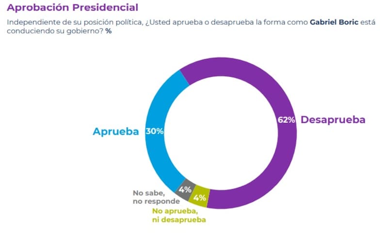 Finalmente, un 30% aprueba la gestión del Presidente Gabriel Boric, marcando un descenso de tres puntos respecto al último sondeo de la semana pasada, mientras que la desaprobación alcanzó un 62%.