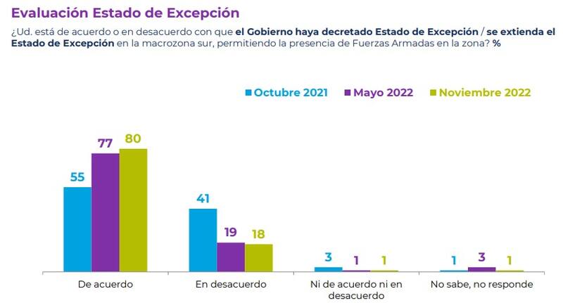 Entre las razones que explicaría principalmente la actual violencia en La Araucanía, el 40% lo atribuye a la presencia de grupos violentistas y de terrorismo en la zona; un 20% a la falta de apoyo y de recursos para Carabineros, y el 15% a la pobreza y la falta de oportunidades del pueblo Mapuche. Es así que el 80% de los consultados está de acuerdo con que el gobierno haya extendido el estado de excepción en la macrozona sur, permitiendo la presencia de Fuerzas Armadas en el territorio.