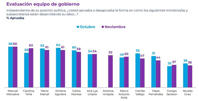Por su parte, la titular de Defensa, Maya Fernández (44%); de Desarrollo Social, Giorgio Jackson (37%); y de Economía, Miguel Grau (36%), se posicionan como los ministros con menor aprobación.