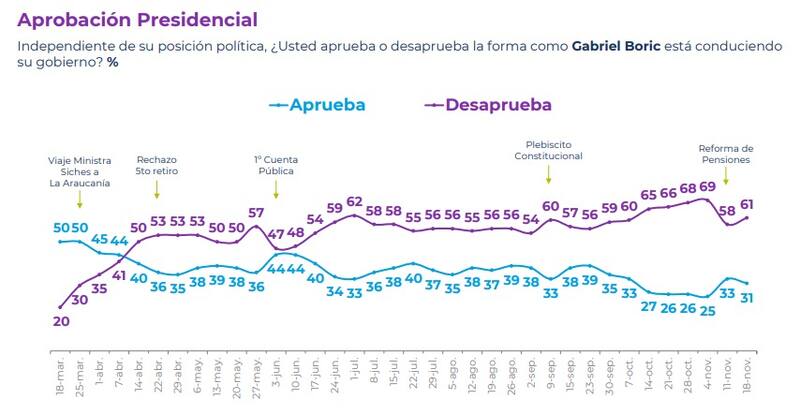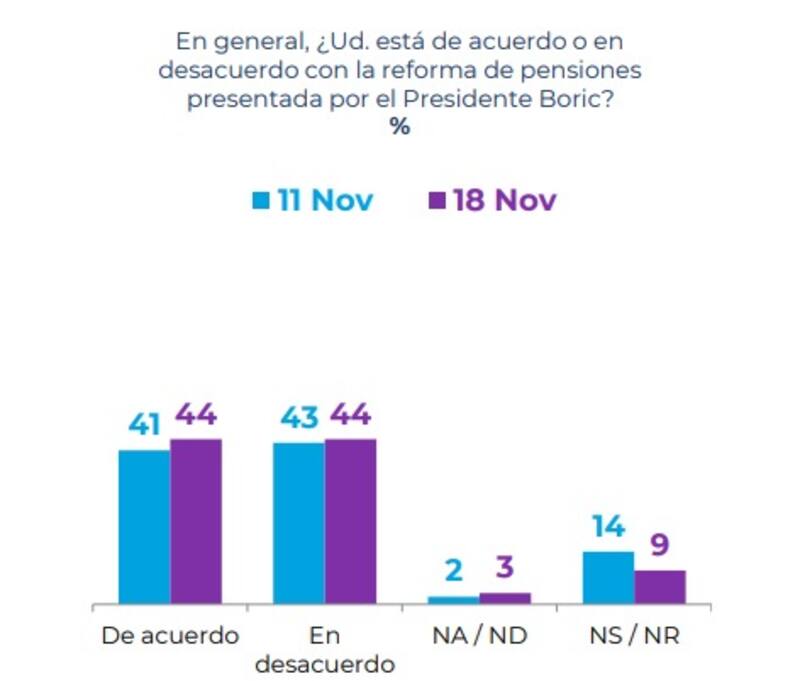Asimismo, esta semana se registra un empate estadístico de un 44% entre quienes están de acuerdo y en desacuerdo con la reforma de pensiones presentada por Boric a inicios de noviembre.