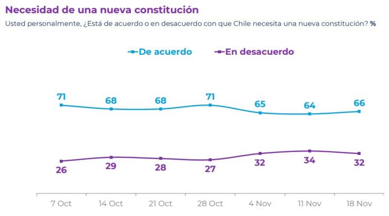 En otro aspecto, y en torno a la discusión constitucional, se evidencia un aumento de 2 puntos porcentuales entre quienes están de acuerdo con que Chile necesita una nueva Constitución, con un 66%.