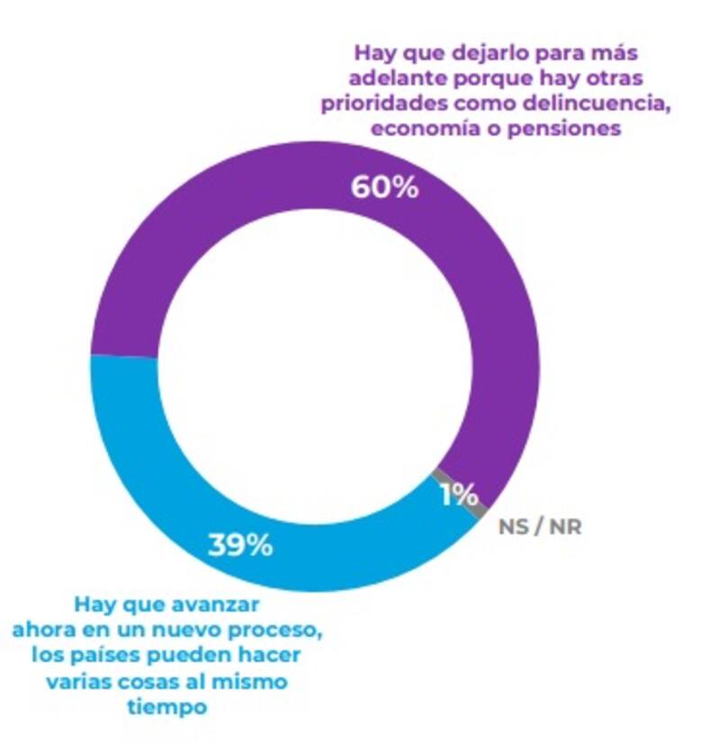 Pese a ello, un 60% opina que hay que dejar este tema para más adelante, debido a la existencia de otras prioridades como la delincuencia, la economía o las pensiones, contra un 39% que cree que hay que avanzar ahora en un nuevo proceso, ya que los países pueden hacer varias cosas al mismo tiempo.
