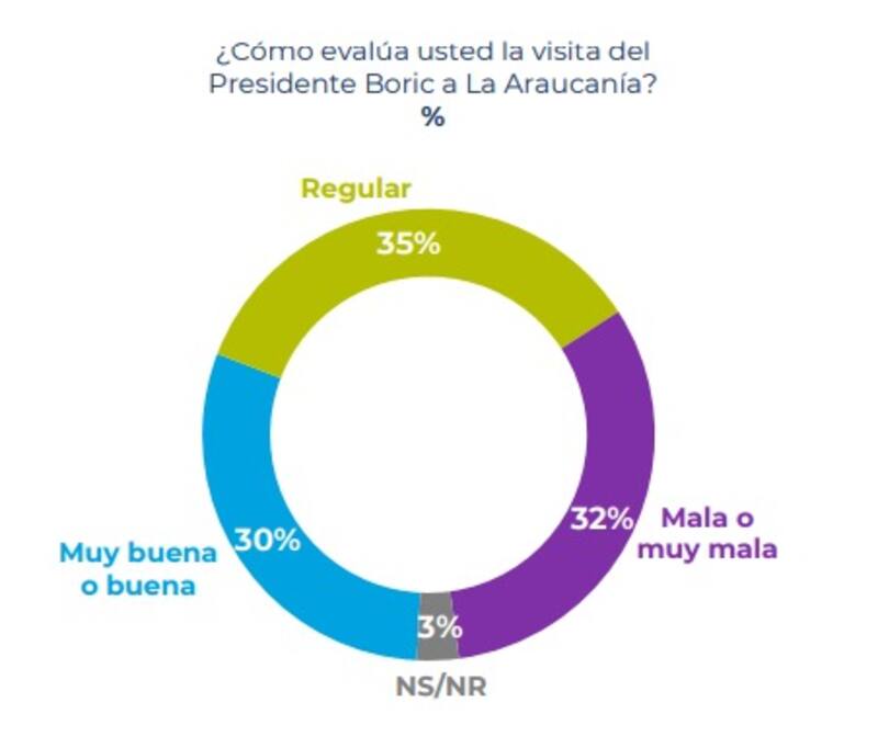 En relación con el viaje a la Región de La Araucanía que realizó el Presidente Boric el pasado miércoles 9 de noviembre, un 35% de los encuestados lo evaluó como regular; un 32% como malo y el 30% lo calificó de manera positiva.
