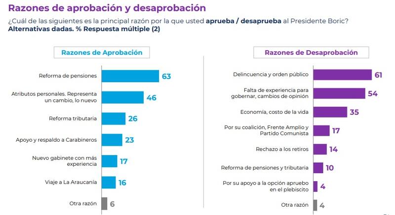 Por otra parte, quienes aprueban su gestión se basan en la reforma de pensiones (63%); sus atributos personales y que representa un cambio (46%); y la reforma tributaria (26%).