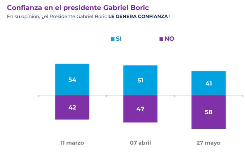 Cabe indicar que, según la tendencia registrada durante marzo, la aprobación de Boric llegó al 48% en el total de aquel mes, mientras que su desaprobación se situó en el 28%, estadística que en abril se disparó y llegó al 49%, en promedio.