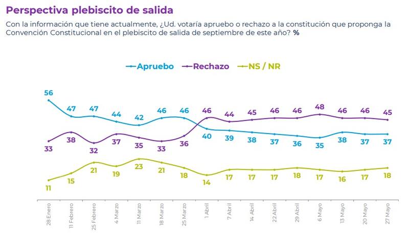 Esta semana, las cifras relacionadas con el plebiscito de salida del próximo 4 de septiembre no evidenciaron mayores cambios respecto a la semana anterior, donde el 37% de los consultados manifestó su intención de votar Apruebo y mientras que la opción Rechazo cayó un punto y quedó en 45%. A la vez, la confianza en la Convención Constitucional aumentó al 45%.