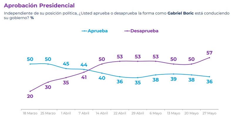 Este domingo fueron publicados los resultados de la encuesta Plaza Pública Cadem correspondiente a la última semana de mayo, la cual reveló que durante en los últimos siete días hubo un incremento de 7 puntos porcentuales en la desaprobación al Presidente Gabriel Boric, alcanzando el 57%.