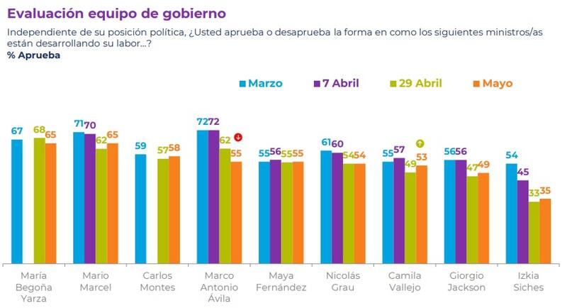 No obstante, el jefe de la cartera de Educación, Marco Antonio Ávila, consignó una importante caída, puesto que durante los meses de marzo y abril se posicionaba como el ministro mejor con mayor aprobación (72%), cifra que el 29 de abril cayó a 62% y hoy alcanza el 55%. En tanto, Izkia Siches se mantiene cómo la secretaria de Estado peor evaluada, con un 35%.
